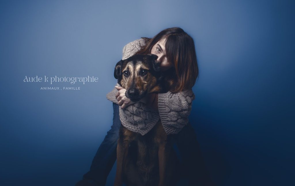 Je suis Aude, photographe pour animaux de compagnie et le chien avec moi c’est Kenaï (11 ans).